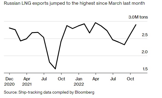 数据显示,近一半的船载天然气仍在运输中,最大的进口国是法国、中国和日本。目前没有针对俄罗斯液化天然气的任何直接制裁,出口的增加表明全球在为冬季做准备时,燃料需求依然强劲。
