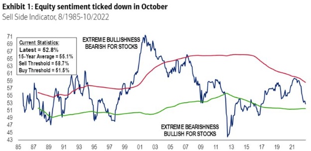 智通财经APP获悉,根据美国银行的一项衡量股市看涨程度的指标——美银卖方一致性指标(Sell Side Indicator),已接近历史上预示市场将上升的水平。包括股票与量化策略师Savita Subramanian在内的美银团队表示,该指标评估卖方策略师对股票的平均建议配置,表现出5年多来最接近触发买入信号的水平。