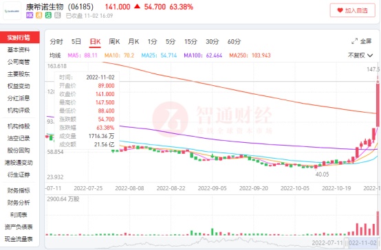 当然,其中领涨的当属康希诺生物(06185),当日盘中其股价最大涨幅达到70.9%,近七个交易日累达160%。