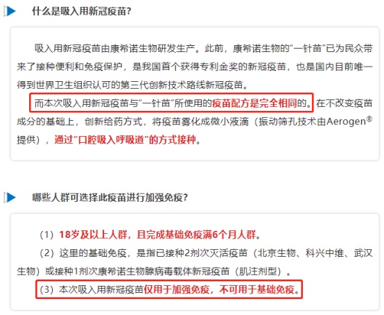 实际上,此次康希诺推出的吸入式新冠疫苗并非“新品”。根据康希诺官方介绍,该吸入用新冠疫苗与“一针苗”所使用的疫苗配方完全相同且只能用于加强针。也就是说,与康希诺此前推出的新冠“一针苗”相比,该产品仅仅改变了给药方式。而此次二级市场炒作的正是这个“创新给药方式”。