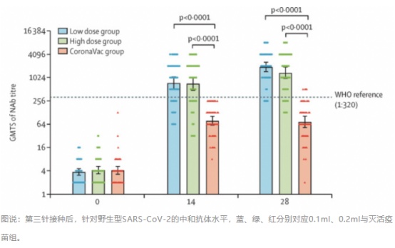 临床结果显示,接种28天后,针对原始毒株,0.1ml组的中和抗体GMT值为1937,0.2ml组为1351,而同源灭活疫苗加强组仅为73.5(26倍和18倍);接种28天后,针对德尔塔变异株,异源吸入式Ad5-nCoV引发的中和抗体水平比WHO国际标准高出约3倍,而灭活疫苗同源接种,则不到国际标准的20%。