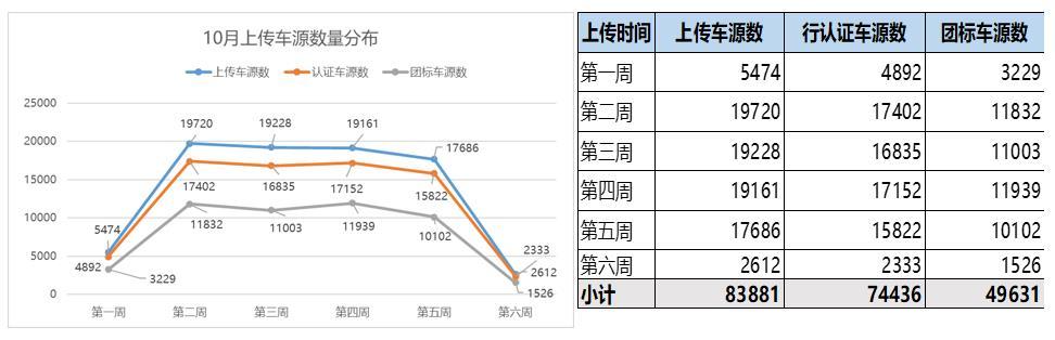 2022年10月,行认证共接收到上传车源数据83881,较9月份降低约6%,其中符合行认证标准的车源数据74436较9月降低约5%。