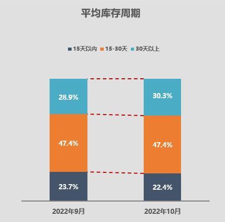 调研显示,2022年10月份库存周期15天以内的企业占22.4%,较上月占比减少了1.3个百分点。库存周期在15-30天的企业占47.4%,与上月持平。库存周期30天以上的企业占30.3%,较上月占比增加了1.3个百分点。