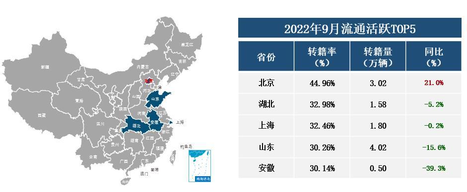2022年9月,全国转籍比例排名前五的省份是北京、湖北、上海、山东、安徽。其中北京转籍率最高为44.96%,湖北、上海、山东、安徽四省转籍率超过30%。具体从转籍量来看,北京增长明显同比增长21%,为3.02万辆。其余四省同比均有所下降,其中安徽省下降明显,同比下降39%,转籍量为0.5万辆。山东较去年同期下降了15.6%,转籍量为4.02万辆。