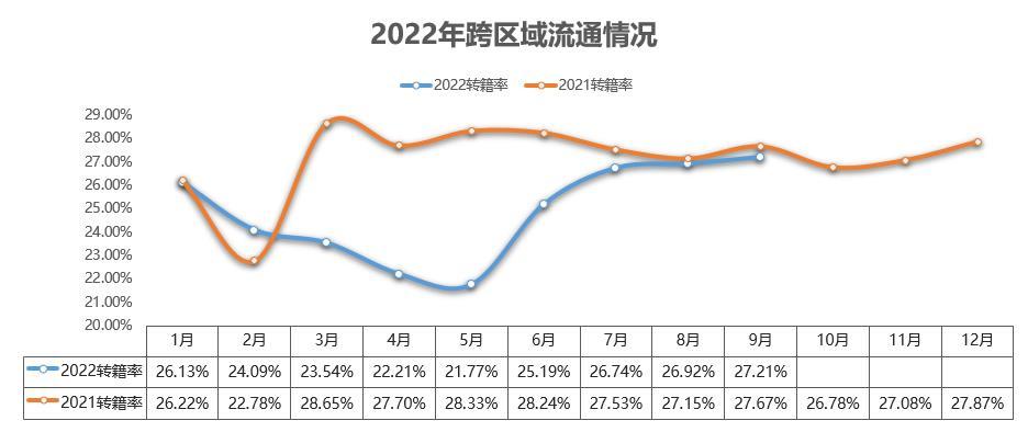 9月份是传统的消费旺季,加上国庆假期出行需求增加,对于汽车消费有一定的促进作用。另一方面受疫情影响,全国多地防控措施收紧,对于二手车跨区域流通产生一定影响。尤其是四川及周边一些省份交易量出现明显回落。整体来看9月份转籍情况小幅回升,二手车转籍率较8月份小幅增加了0.3个百分点,转籍率为27.21%,已接近去年同期水平,预计10月份全国二手车跨区域流通情况会持续好转。