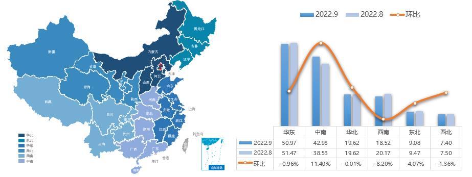 2022年10月,广东、山西、江苏、河南较上月明显,其他区域基本保持平稳。