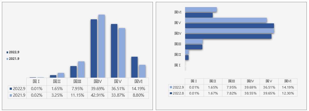 2022年9月,二手乘用车中,国三、国四、国六排放车型环比有所增加,国二、国五车型占比有所下降。其中国五车型环比下降了3.14个百分点,较去年同期增加了2.64个百分点。国六车型环比增加了1.89个百分点,较去年同期增加了5.39个百分点。国四车型环比增加了1.14个百分点,较去年同期减少了3.22个百分点。