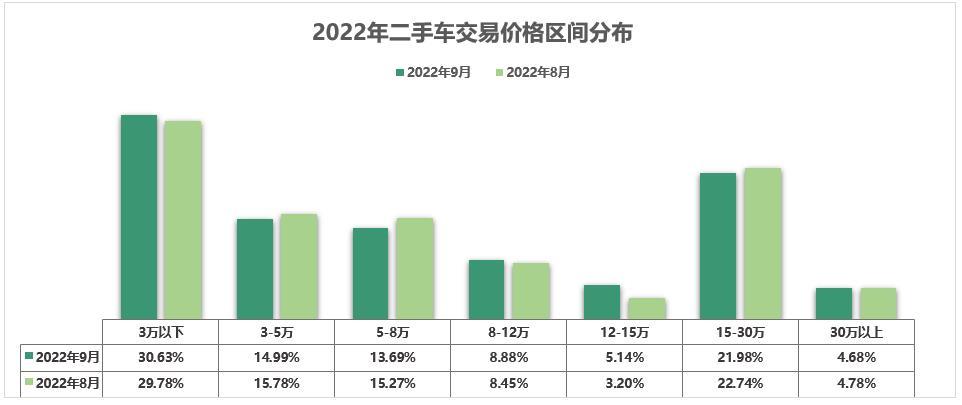 整体来看9月份,8万以内的二手车占69.7%,较上月减少了2.6%,其中5万元以内的占5.22%,较上月下降了2.8%。15万以上的占比较上月增加了2.8个百分点。
