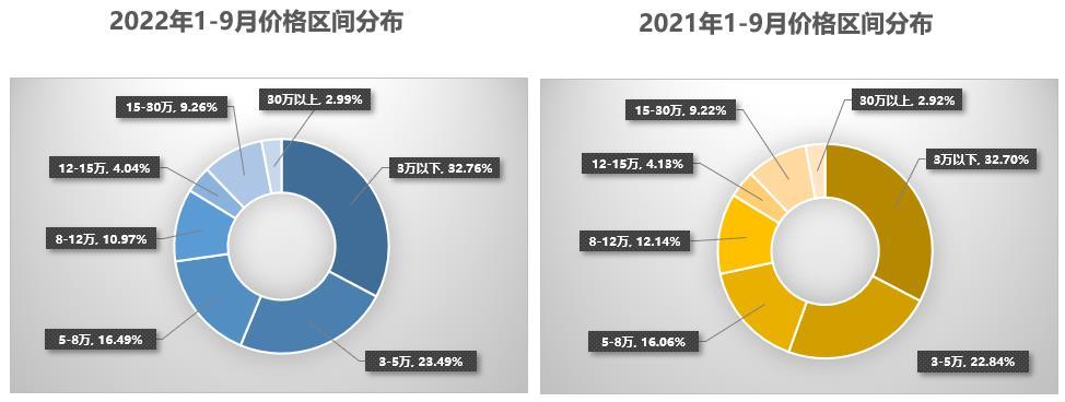 1-9月,价格在3万元以内的二手车占比最大,占比为32.76%。与去年同期相比略有增加,同比增加了0.1个百分点。