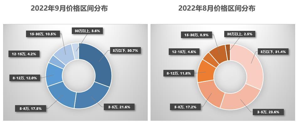 9月份,5-8万、8-12万、15-30万和30万以上区间交易量占比小幅增加,其他价格区间交易量占比有所减少。