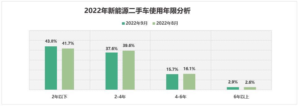 2022年9月,全国新能源二手车使用年限在2年以下的占43.8%,环比上月增加了2.1%,较去年同期增加了22.6%。使用年限在2-4年占37.6%,环比上月下降了2%,较去年同期减少了0.4个百分点。