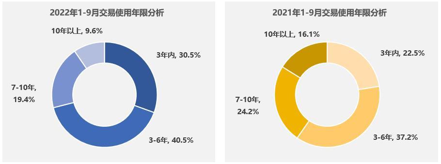 1-9月,二手车使用年限在3-6年的交易量最多,占比为40.5%,较去年同期增加了3.3个百分点;