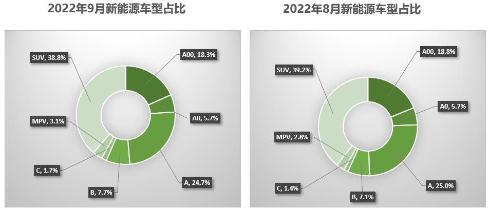 2022年9月,全国新能源二手车中,A0级、 B级、C级、MPV车型交易占比较上月有所增加,其余车型均有不同程度的减少,其中B级车型增长较为明显,较上增加了2.9%,占比为7.7% 。A00级和SUV车型较上月分别下降了0.4和0.5个百分点,占18.3%和38.8%。C级和MPV车型环比小幅增长0.3个百分点,占1.7%和3.1%。