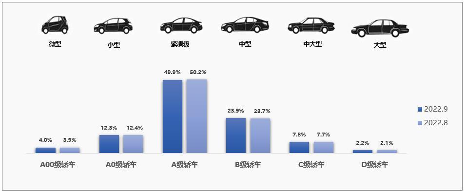 2022年9月,各级别轿车的整体销量来看,A级轿车仍旧是二手车市场中最热销的车型,平均占比为49.9%,较上月减少了0.3%,其次是B级轿车平均占比23.9%,较上月增加了0.2%。C级轿车平均占比7.8%,较上月增加了0.1%。D级轿车占比为2.2%,较上月增加了0.1%;9月,A0级和A级轿车占比较上月略有减少,其余各级别车型较上月略有增加。