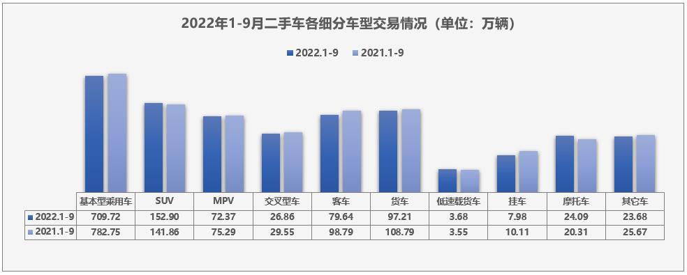 2022年1-9月,全国二手车市场累计交易量1198.12万辆,同比下降7.6%。基本型乘用车共交易709.72万辆,同比下降9.3%;SUV 共交易152.9万辆,同比增长7.8%;MPV共交易72.37万辆,同比下降3.9%;交叉型乘用车共交易26.86万辆,同比下降9.1%。
