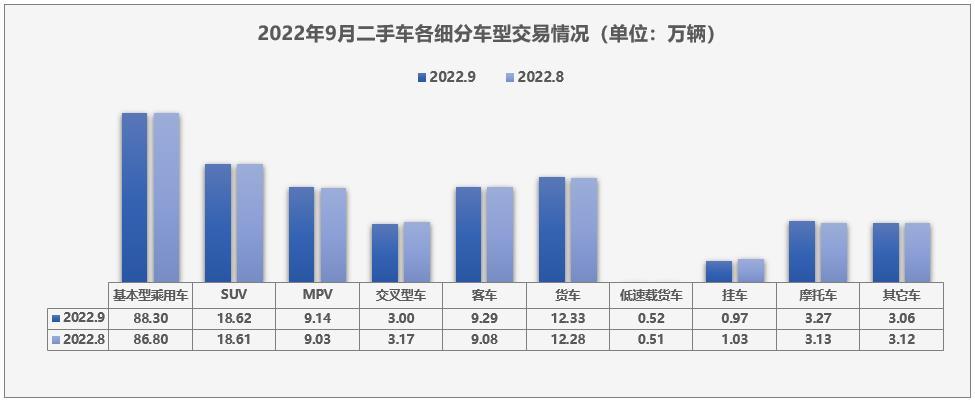 基本型乘用车共交易88.3万辆,环比增长1.72%,同比下降5.9%;SUV共交易18.62万辆,环比增长0.08%,同比增长1.7%;MPV共交易9.14万辆,环比增长1.19%,同比下降0.3%;交叉型乘用车共交易3.0万辆,环比下降5.37%,同比下降23%。