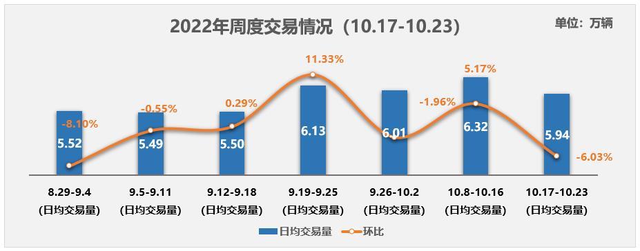 10月第三周日均交易量为5.94万辆,环比上周下降6%,与9月第三周相比下降3%。主要原因长假之后的局部疫情影响了线下的集客效应,跨区域流通也有所放缓。再者,交易需求在9月中下旬至10月中上旬基本释放完毕,对于后期的集客和成交构成压力。