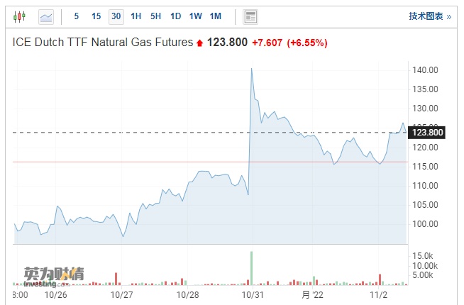 智通财经APP获悉,由于供应担忧抵消了更温暖的天气的影响,欧洲天然气价格上涨。截至发稿,荷兰近月天然气期货上涨6.55%,报123.8美元。