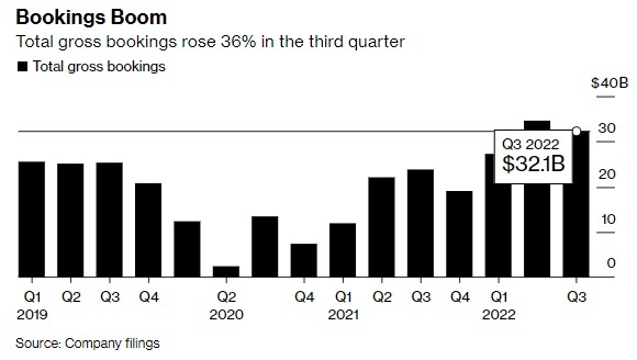 Booking第三季度总预订量(包括客户预订的所有旅行服务(扣除取消))增长 36% 至 321.2 亿美元。分析师此前预测为 307.4 亿美元。预订的房晚数同比增长了 32%,达到 2.4 亿,分析师此前预测为 2.369 亿。