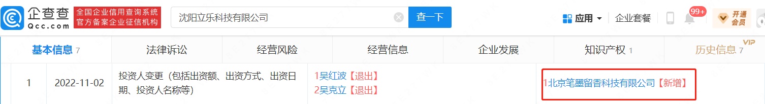智通财经APP获悉,企查查APP显示,11月2日,沈阳立乐科技有限公司发生工商变更,原股东吴红波、吴克立退出,新增北京笔墨留香科技有限公司为唯一股东,后者为北京抖音信息服务有限公司全资子公司。据公开资料显示,沈阳立乐科技有限公司成立于2022年8月,注册资本100万人民币,经营范围包括互联网信息服务、信息技术咨询服务、信息咨询服务等。