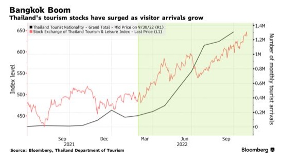 智通财经APP获悉,随着游客数量的增加,泰国的旅游股也在攀升。泰国最大的私人基金管理公司表示,泰国股市明年可能试探此前的创纪录水平,原因是人们乐观地认为,国际游客的回归将提振经济增长和企业盈利。