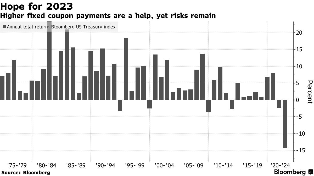 彭博情报(Bloomberg Intelligence)表示,收益率要比今年早些时候高得多,才会触发总回报修复。与此同时,美国银行对250年债券市场数据的分析显示,如果历史能够借鉴的话,2023年的回报率或将为正。