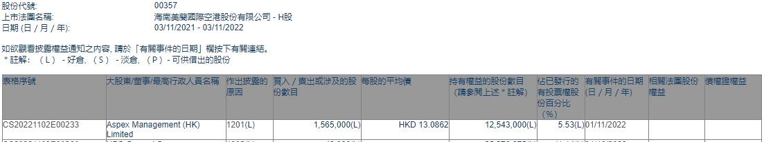 智通财经APP获悉,香港联交所最新资料显示,11月1日,Aspex Management (HK) Limited减持美兰空港(00357)156.5万股,每股作价13.0862港元,总金额约为2047.99万港元。减持后最新持股数目为1254.3万股,最新持股比例为5.53%。