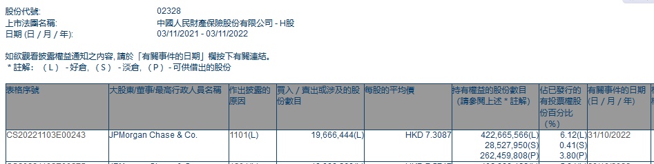 智通财经APP获悉,香港联交所最新资料显示,10月31日,小摩增持中国财险(02328)1966.6444万股,每股作价7.3087港元,总金额约为1.44亿港元。增持后最新持股数目约为4.23亿股,最新持股比例为6.12%。