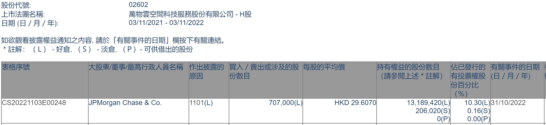 智通财经APP获悉,香港联交所最新资料显示,10月31日,小摩增持万物云(02602)70.7万股,每股作价29.6070港元,总金额约为2093.21万港元。增持后最新持股数目约为1318.94万股,最新持股比例为10.30%。