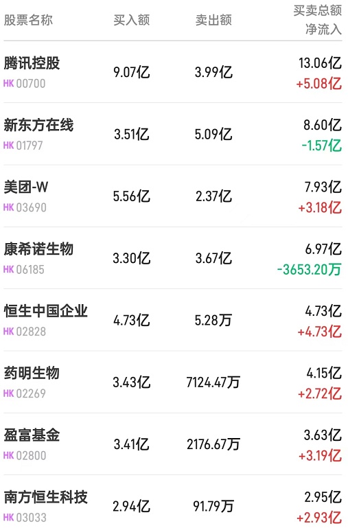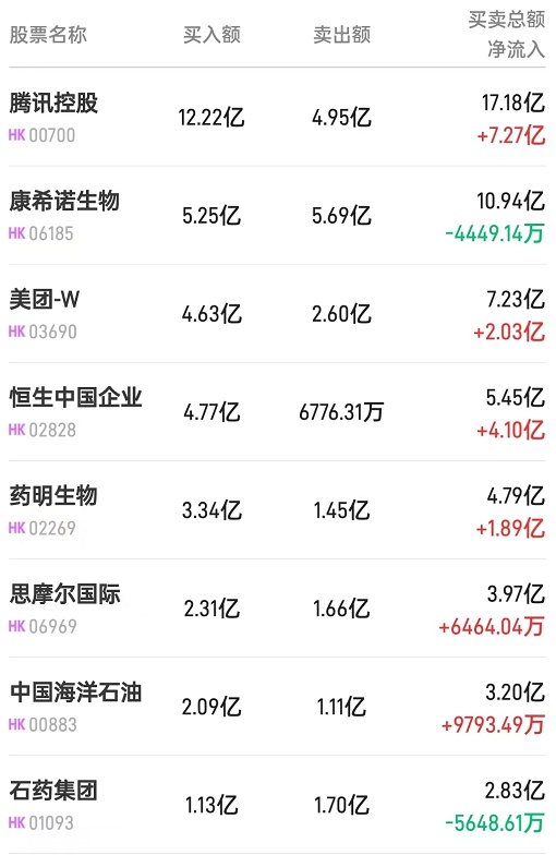 北水净买入最多的个股是腾讯(00700)、恒生中国企业(02828)、美团-W(03690)。北水净卖出最多的个股是康希诺生物(06185)。