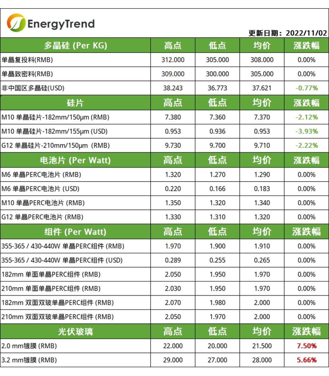 本周组件价格继续维稳,单晶166组件主流成交价为1.91元/W左右,单晶单面182组件主流成交价为1.97元/W左右,单晶单面210组件主流成交价为2元/W左右;182双面双玻单晶PERC组件主流成交价为1.97元/W,210双面双玻单晶PERC组件主流成交价为2元/W。