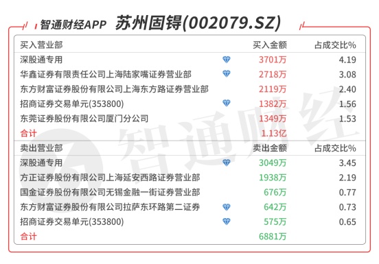 苏州固锝(002079.SZ):龙虎榜阵容豪华,深股通对倒净买入652万元,买二是知名游资的席位买入2629万元,买五是知名游资的席位买入1346万元,当日净买入5084万元,该股今日一举突破所有均线,预计有溢价。