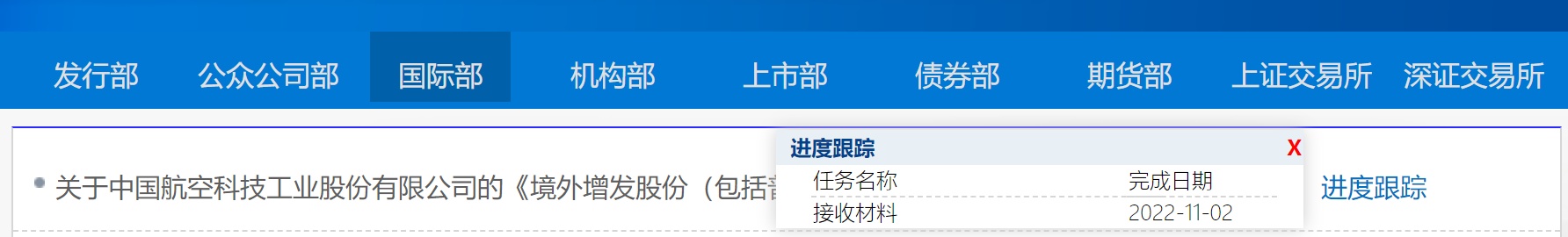 智通财经APP获悉,11月2日,证监会公布中国航空科技工业股份有限公司(中航科工,02357)的《境外增发股份(包括普通股、优先股等各类股票及股票的派生形式)审批》进度,目前进度已达接收材料阶段。