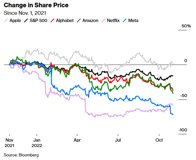 当一只大盘股股价跳水时,就像Meta Platforms(META.US)在10月27日大跌近25%那样,投资者通常会被敦促要从长远来看它的表现。不过,这种建议已经没什么用了。如果投资者在五年前买入当时还被成为Facebook的这只股票的话,回报率将是-49%,而同期内标普500指数则上涨了45%。在疫情让社交媒体成为一项重要技术的情况下,Meta现在不仅抹去了疫情带来的红利,还跌回了2015年的水平。