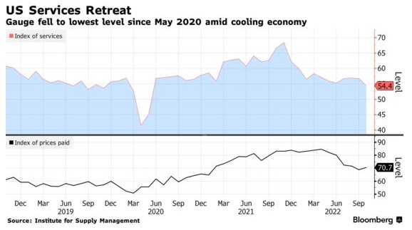 该报告表明,在高通胀、利率上升和经济前景不明朗的情况下,对服务的需求正在放缓。尽管美联储周三又将利率提高了 75 个基点以缓解通胀压力,但其收紧政策的行动可能会导致经济陷入衰退。