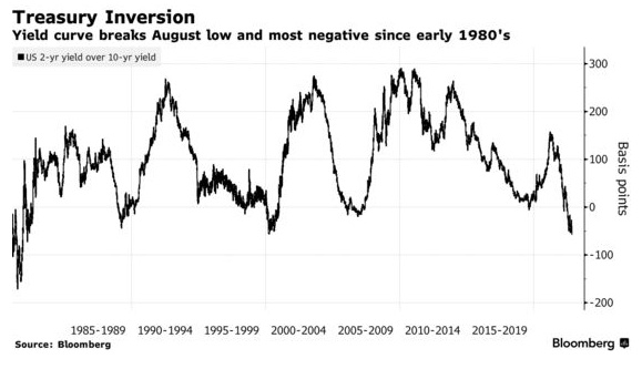 2年期国债收益率比10年期国债收益率高出58.6个基点。8月10日,收益率倒挂一度超过58个基点,上一次出现这种情况是在大约40年前,当时时任美联储主席沃尔克为抑制通货膨胀而加息,此举重创了美国经济。曲线反转的跟踪记录显示,经济衰退将在未来12到18个月。