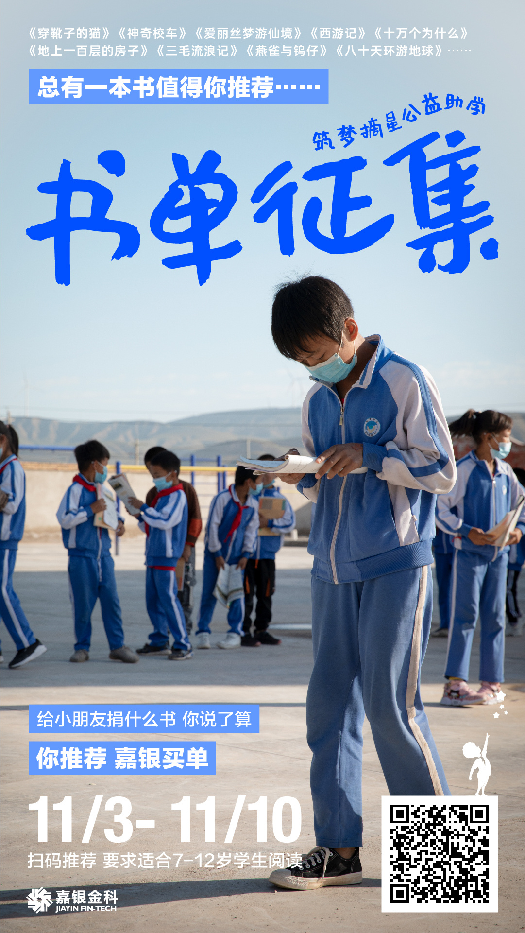 近期,嘉银公益即将赴往偏远地区,再次开启公益助学活动,为学校师生送去关怀,改善师生的教学环境。为建成高质量图书室,保证图书的全面性、可读性、广泛性和综合性,嘉银金科邀请您为适合7-12岁的孩子们推荐一本或多本图书。后续,嘉银公益将根据公众推荐的好书和校方实际需求进行采购,并将这些书籍和其他教学、生活物资一起送到偏远地区孩子的手中。书单征集活动截止时间为2022年11月10日。