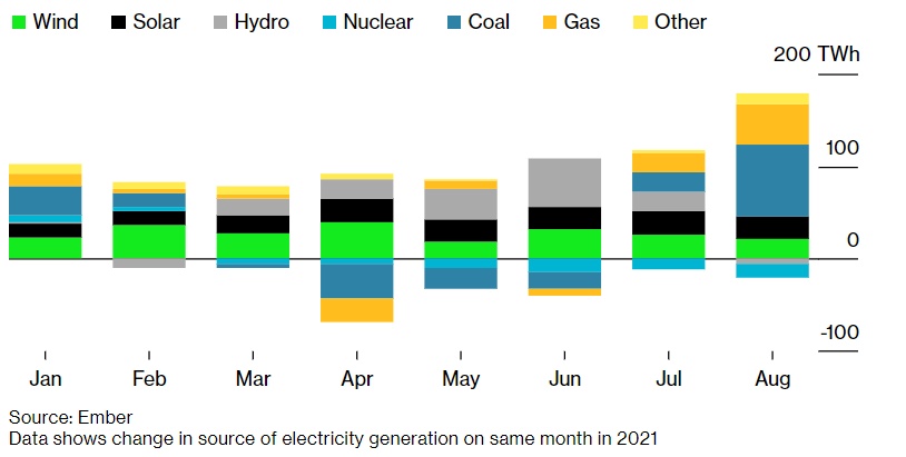 尽管全球受到气候变化造成的洪水、干旱和风暴的打击越来越严重,但对全球变暖排放贡献最多的燃料正在复兴。全球煤炭发电量可能连续第二年创下纪录,仍是全球最大的电力来源。为了弥补水电、核能和俄罗斯天然气等能源短缺,欧洲地区的煤炭消耗量激增。