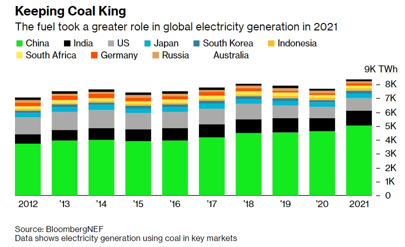 去年本应是终结这种污染燃料的开始,在此之前2019年和2020年的消耗量都有所下降。联合国领导的COP26气候大会主席夏尔马去年11月在格拉斯哥开会时敦促世界各国领导人“让煤炭成为历史”。