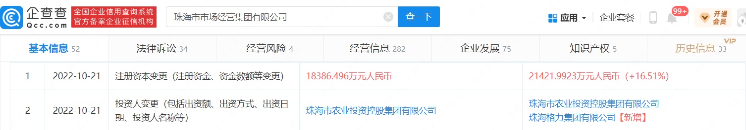 智通财经APP获悉,企查查APP显示,近日,珠海市市场经营集团有限公司发生工商变更,股东新增珠海格力集团有限公司,同时公司注册资本由约1.8亿人民币增至约2.1亿人民币。股东信息显示,该公司现由珠海市农业投资控股集团有限公司和珠海格力集团有限公司共同持股。据公开资料显示,珠海市市场经营集团有限公司是珠海市主要“菜篮子”民生工程国有企业,专门从事农贸市场和农产品批发市场的开发建设、经营管理以及农副产品的生产、加工、销售、配送、仓储、冷冻等相关业务。