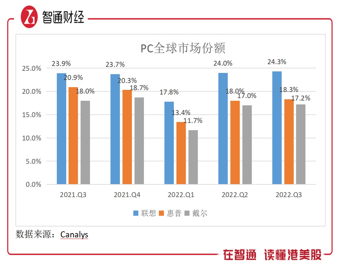 IDC及Canalys均是全球知名的市场调研机构,公布的数据差距不大,Canalys数据显示,今年Q3全球个人电脑市场规模同比下降18%,联想市场份额稳居第一,为24.3%,领先惠普及戴尔的差距分别扩大至6个及7.1个百分点,领先优势创造了历史最高点。在行业不景气下,联想的韧性也充分体现在业绩上。