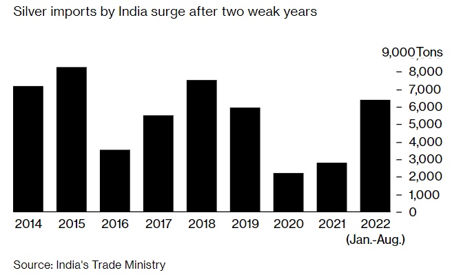 智通财经APP获悉,印度的白银消费量预计今年将飙升约80%,达到创纪录水平。根据印度贸易部的最新数据,该国1月至8月白银的进口量达到6370吨,而去年同期仅为153.4吨。2021年,印度一共进口了2803.4吨白银。
