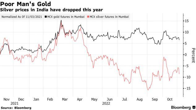 根据伦敦金银市场协会的数据,截至9月底,伦敦金库的白银持有量降至27101吨,为2016年有记录以来的最低水平。印度的白银价格今年下跌了约6%,而黄金上涨约5%。当地交易所的白银期货价格为每千克58869卢比,仍远低于2020年77949卢比的记录。