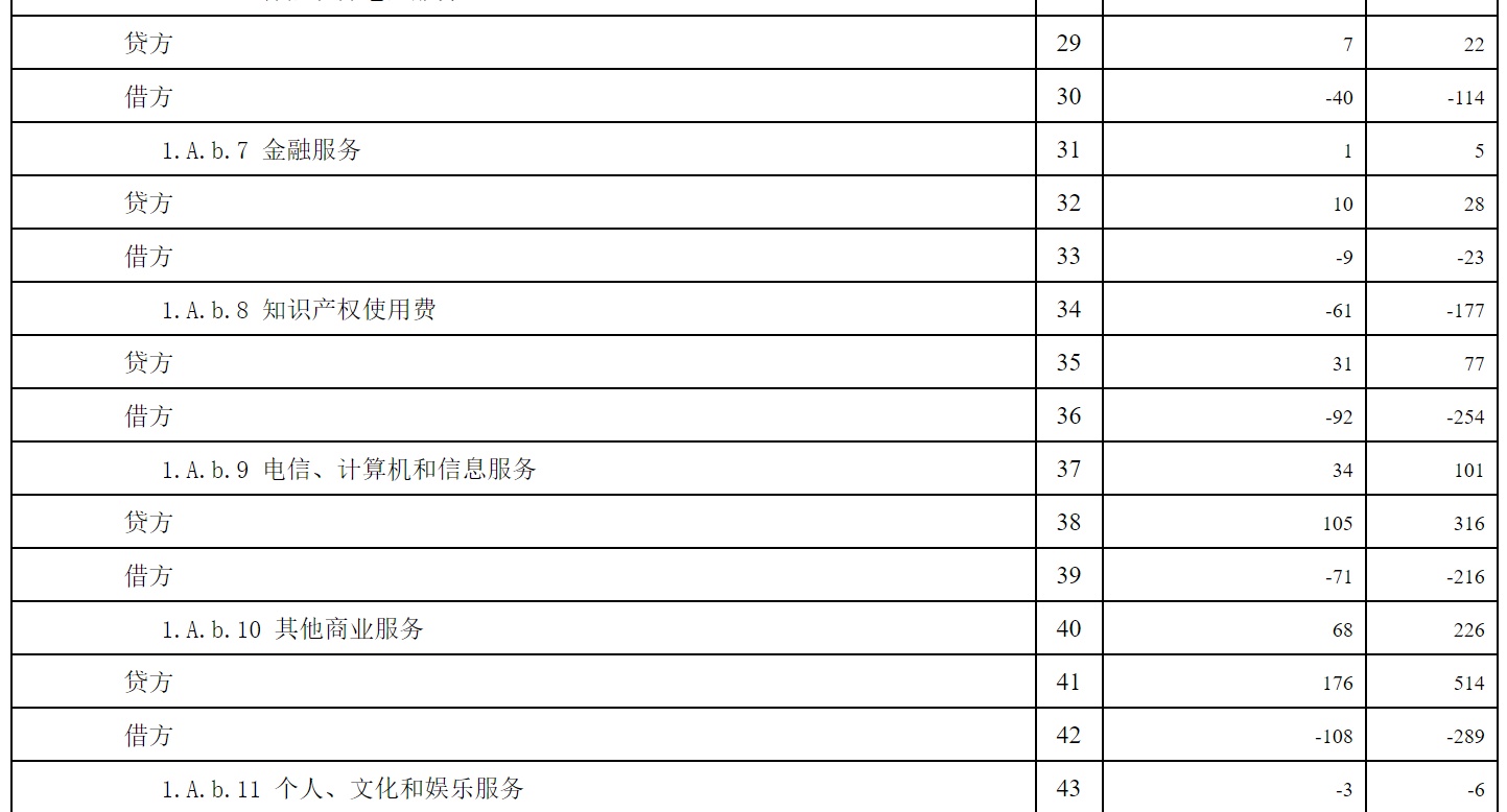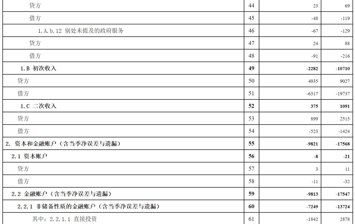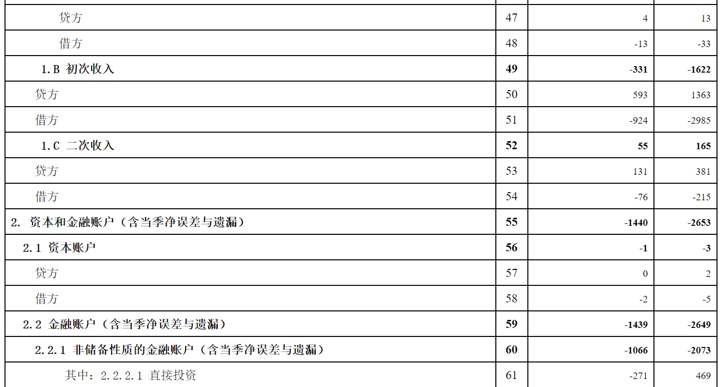 2022年三季度,我国经常账户顺差9821亿元,其中,货物贸易顺差13725亿元,服务贸易逆差1998亿元,初次收入逆差2282亿元,二次收入顺差375亿元。资本和金融账户中,直接投资逆差1842亿元,储备资产增加2564亿元。