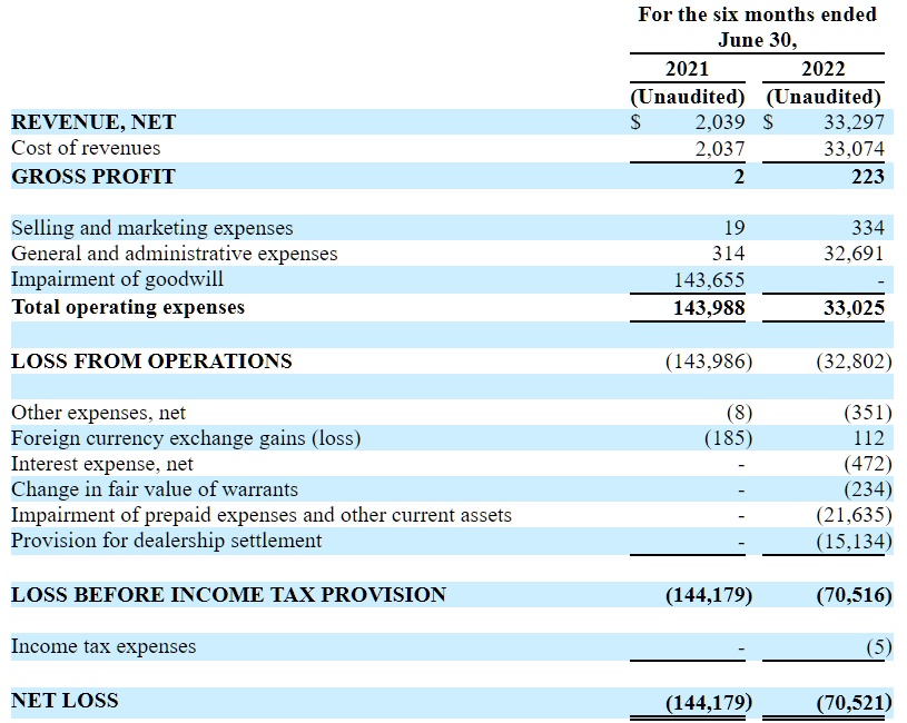 相较之下,公司的新车批发业务从上年同期的203.9万美元大幅减至当期的28.3万美元。也就是说,由于新车销售不顺利,开心汽车将2021年同期已经终止的二手车销售业务又重新捡起来,还让营收大涨了15倍。