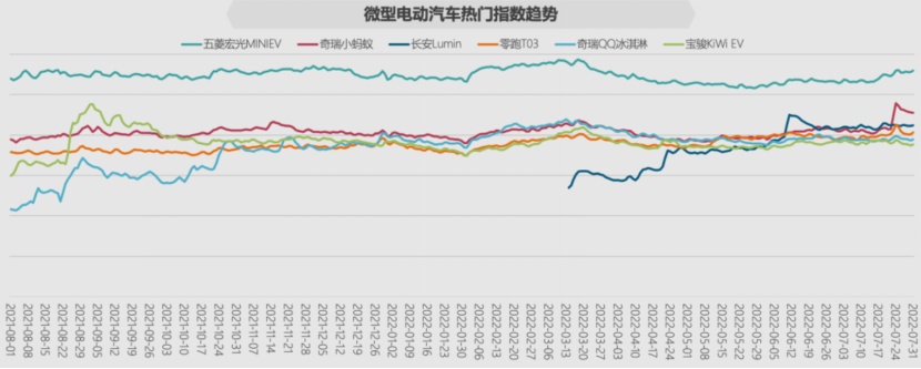 并且从热门指数趋势看,微型轿车头部的车型都是微型电动汽车,传统能源的微型轿车已经销声匿迹。并且除了五菱宏光MINIEV稳居高位之外,不断有新的微型电动汽车加入战局。宝骏KiWi EV、奇瑞QQ冰淇淋、长安Lumin等,彼此间热门指数相差不大、交替上升,竞争激烈。