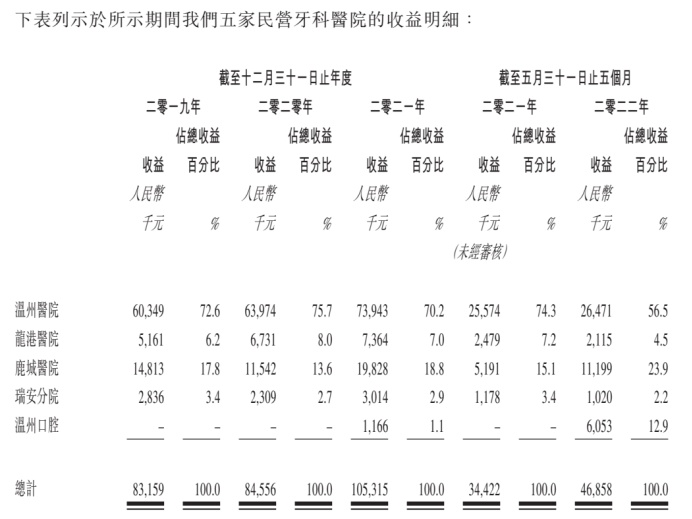 这一问题在更新的招股书中得到一定改善,随着温州口腔逐渐投入常规运营,其为公司贡献收入规模逐渐加大。截至2022年前五个月,温州口腔贡献收入占收比为12.9%,温州医院收入占比得以下降至56.5%的水平,“偏科”有所缓解。