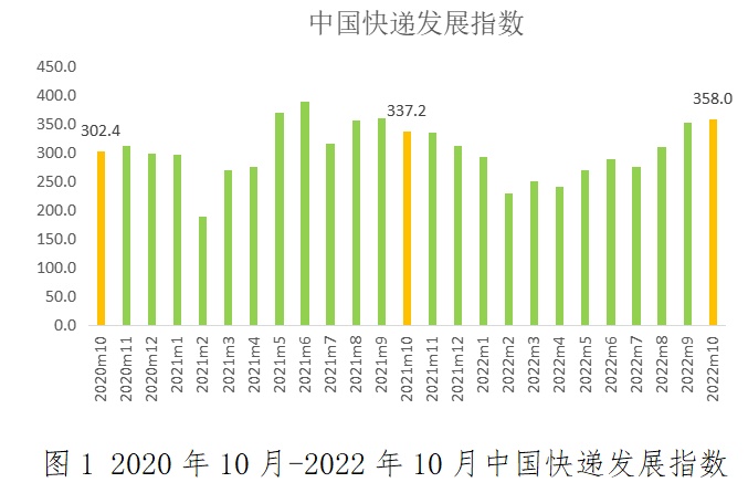 经测算,2022年10月中国快递发展指数为358,同比增长6.2%。其中发展规模指数为389.3,同比下降0.99%;服务质量指数和发展能力指数分别为572.6和209.1,同比分别增长15.6%和0.2%;发展趋势指数为66.4。总体看,行业发展平稳,质效明显改善,能力稳中有升。