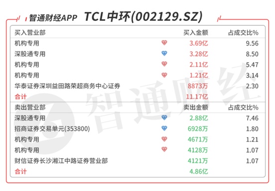 TCL中环(002129.SZ):受到众多机构青睐,今日共5家机构席位出现在龙虎榜单上,合计净买入6.19亿元,深股通大单对倒净买入3988万元,买五是知名游资的席位买入8777万元,当日净买入6.66亿元,该股今日突破年线,预计压力位在半年线附近。