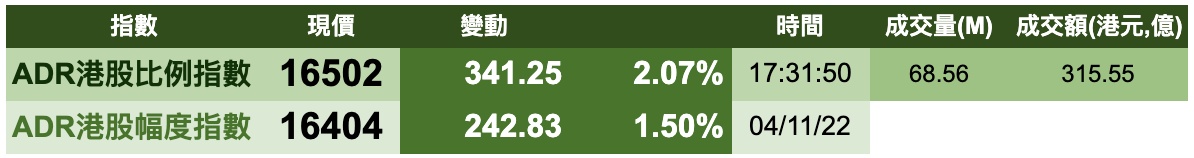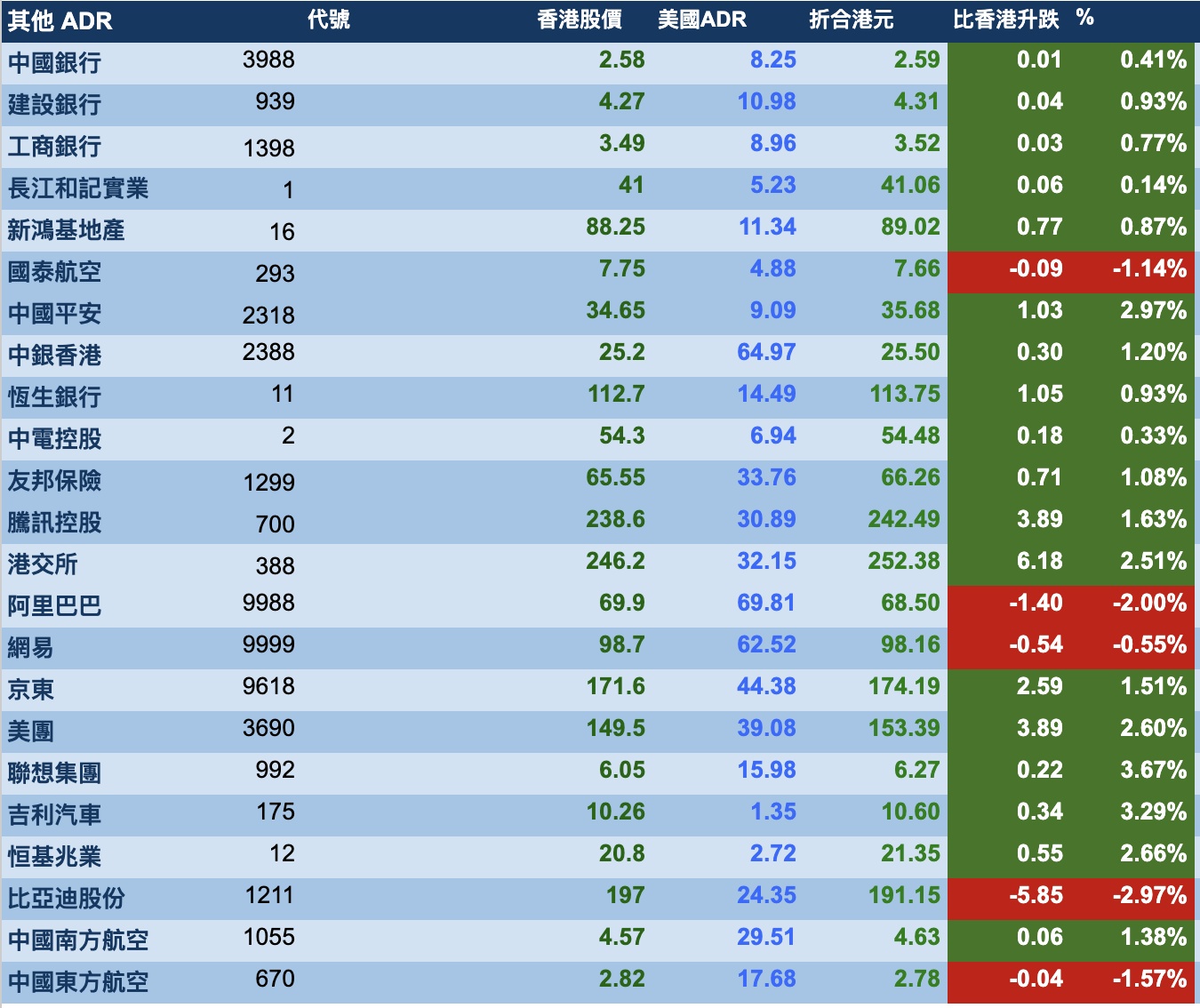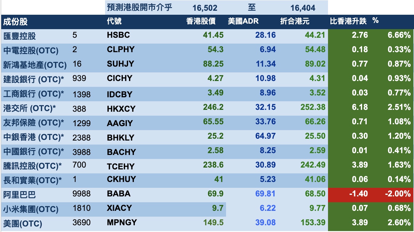 智通财经APP获悉,周五,美股三大指数悉数大涨,港股ADR指数跟随上涨,按比例计算,收报16502点,较香港收市涨341.25点或2.07%。